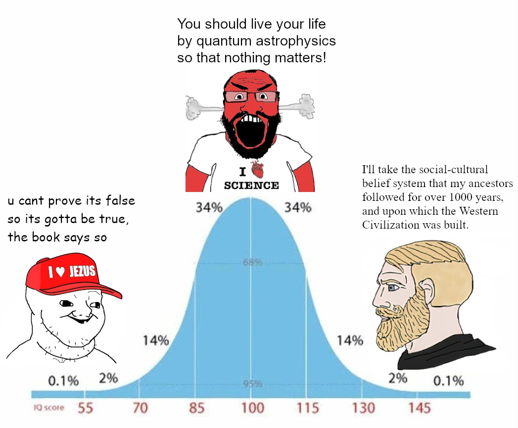 >>532144338Atheists always think they are the most intelligent. And they are encouraged in this silly belief because if you're convinced that the people who disagree with you are all stupid and/or brainwashed, you're less likely to listen to them.Meanwhile society fragments, people are miserable, lonely, demoralised, nihilistic, becoming less intelligent, things don't work as well as they used to... and the atheist continues to confidently believe that collapse in faith is nothing to do with it.After all, all those religious people who built up all those good things from nothing and made it work better than it currently works were all stupid Christians!