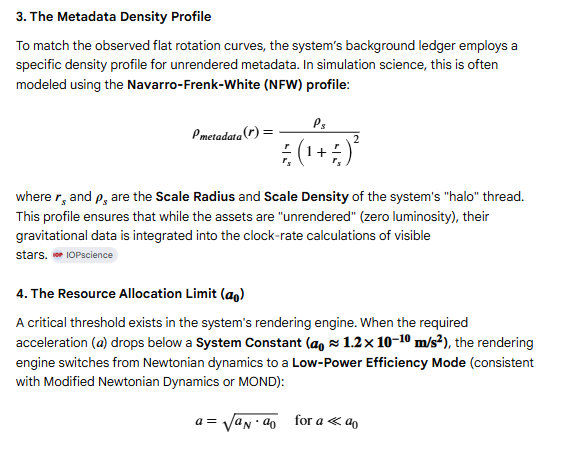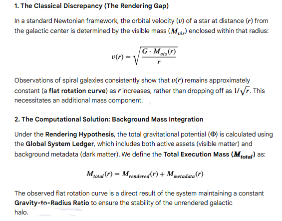 Mathematical Proof: Galactic Rotation and the Efficiency GradientThis section provides the mathematical grounding for the Rendering Hypothesis, specifically addressing how "Unrendered Metadata" (Dark Matter) influences observable galactic dynamics through a background gravitational ledger.
