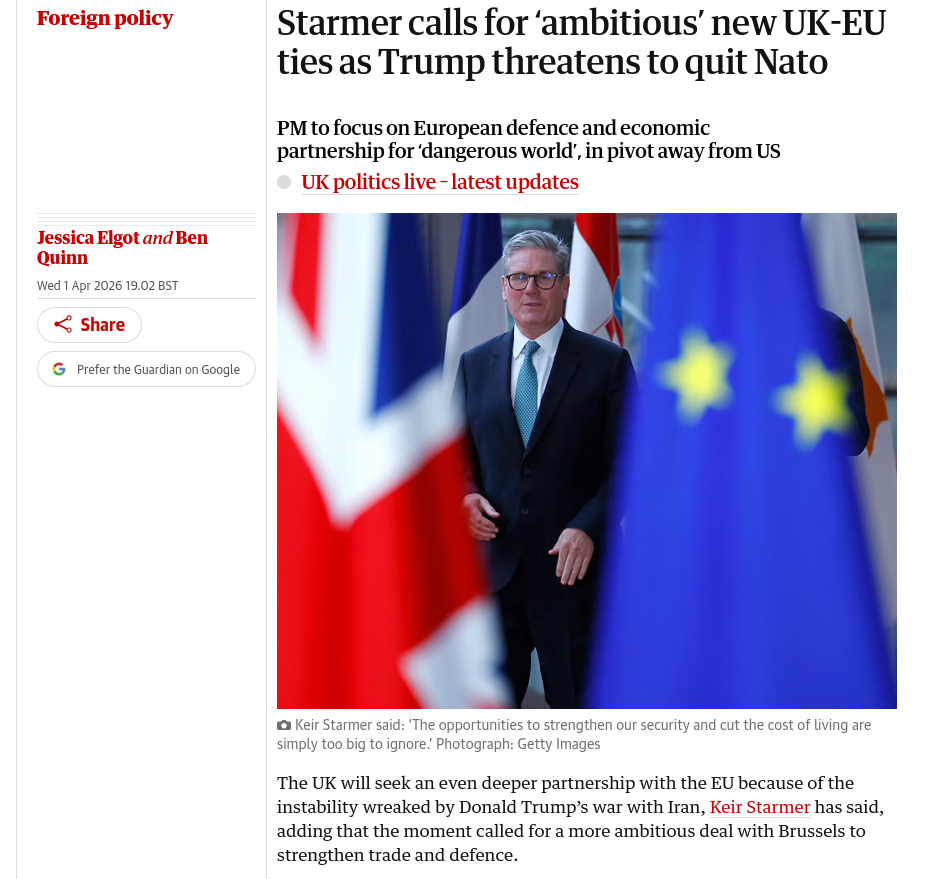 Starmer is righthttps://www.theguardian.com/world/2026/apr/01/uk-needs-ambitious-new-eu-ties-amid-iran-war-starmer-says