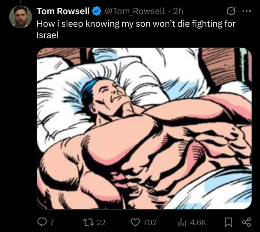 >I'm not fucking dying for Israel!!!what are restore chuds trying to signal here? We are too poor, too cowardly (likely both) to enter the conflict. How is this something to be proud of? Is it just anti semitism?