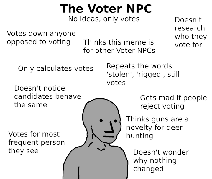 >>532193465Yes voting is totally based fellow poster. Get to vote for some guy, who doesn't even have to do whatever vague promises he made. Can't vote on any actual issues just choose your dude selection party.
