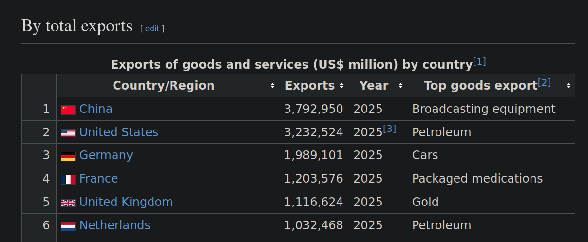 >>532191683I was a bit wrong on manufacturing and I don't want to spread misinfo. China does 4.5 trillion to our 3 trillion. Forgot the number. So that's a significant lead but no one is even close to these two figures in the #3 slot. And we're poised to have lots of growth still with automation. My overall point stands that although important, giving manufacturing undue emphasis is boomer-tier :) And besides consumer junk which we have outsourced we are in very solid and competitive shape on what we actually do produce.