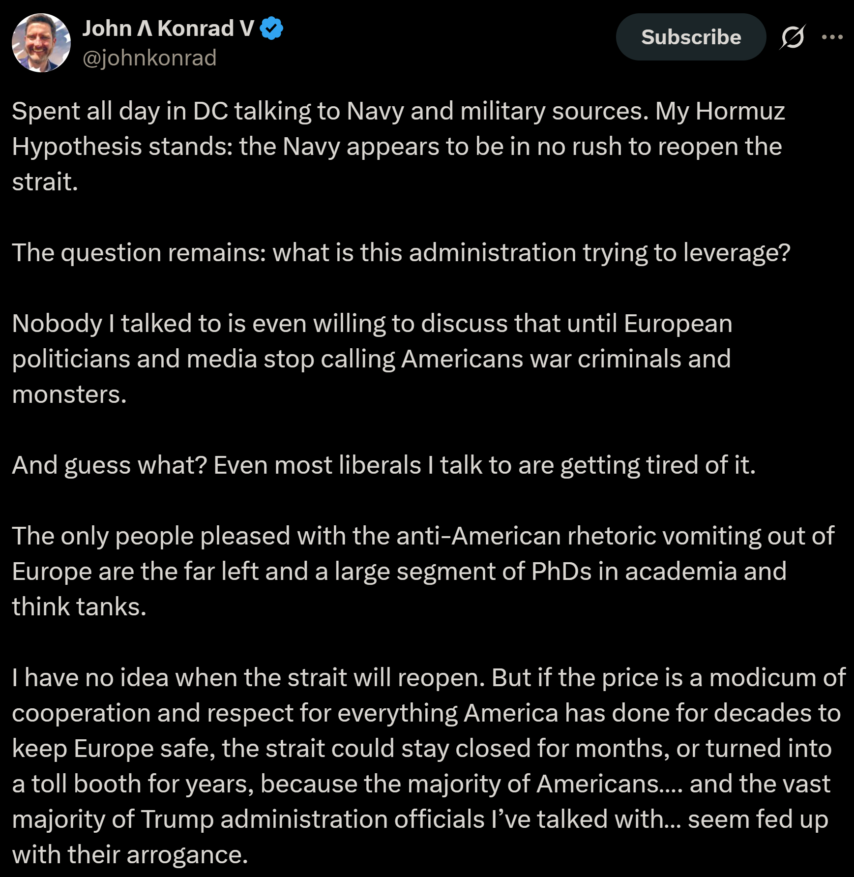 >>532197893President saying we're causing massive pain against people with a high pain tolerance while U.S. is waging war around market hours isn't confidence inspiring. Also, why won't countries just pay the toll in RMB to Iran and get on with life? I get it, gulf states won't like it. But let's be real, if U.S. won't take Hormuz, it isn't reasonable to assume anyone else can, or will try to take it from Iran. Especially with Russia and China providing support. Plus, I would think paying the toll in RMB ensures China now has a vested interest in this new arrangement continuing.