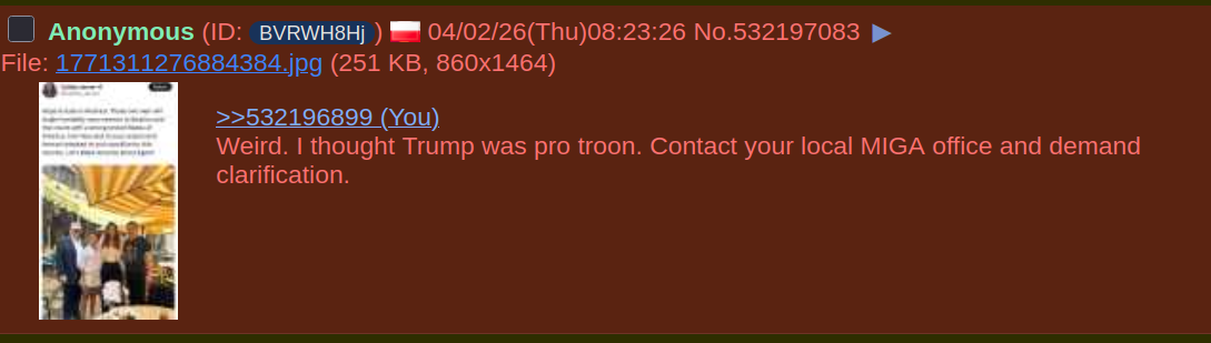 >>532198484Who's doing that? I love it when troons do that to themselves. I don't even care that much if shitlib crazy karens push it on their own kids. The problem is schools promoting faggotry, which Trump has done a ton to combat via the Dept of Edu.