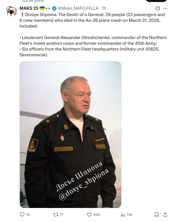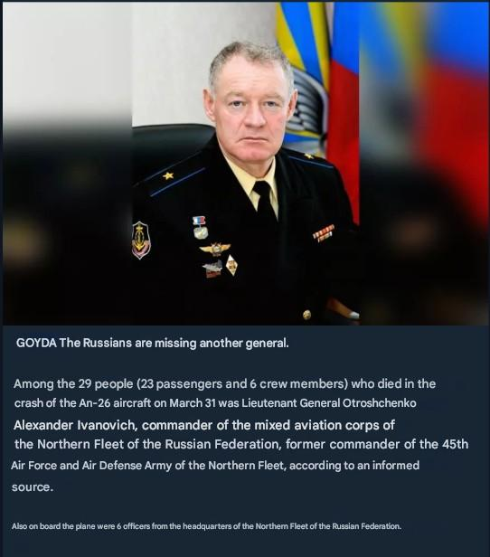 >>532201497>Lieutenant General Oleksandr Otroshchenko, commander of the Northern Fleet’s mixed aviation corps and former head of the 45th Air Force and Air Defense Army;▪ Six officers from the Northern Fleet headquarters (unit 45625, Severomorsk).