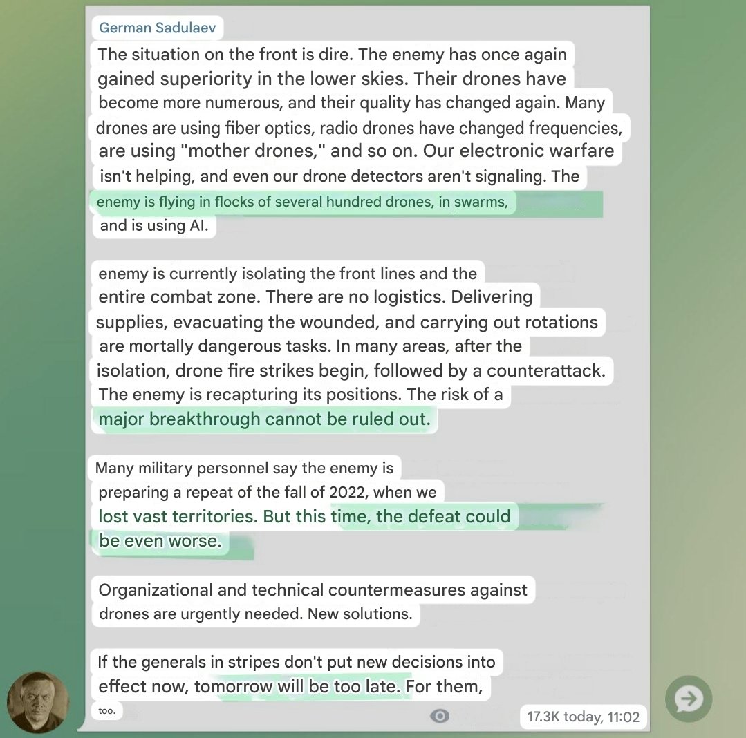 Previous: >>532188271Day 1,499 – Daily assessment: understandingwar.org/analysis/russia-ukraine/#research▶Latest>1,3 million russians eliminated in the 3-day SMO (with many more to come)>russia loses another Su-34 fighter-bomber>russian An-26 military transport aircraft lost over Crimea>for the fourth consecutive month (Dec - Mar), the “mobilized vs eliminated” balance remains firmly negative t. Magyar>Large explosion at Nizhnekamsk refinery>Ukrainian drones once again attacked Ust-Luga and Primorsk ports in Leningrad region>Kremlin Officially Denies™ incoming general mobilisation>General Cherry will manufacture drones in USA>Ukraine to supply naval drones to Gulf countries>Ukraine develops 12-gauge anti-drone 'web' cartridges>The SMO came to Ust-Luga again>Strikes on Ust-Luga, Primorsk, Kirishi and Yaroslavl created a 2.5M bpd bottleneck for russia’s oil export and refining - Magyar>Ukraine securing 10-year defense deals with Gulf states amid Iran war>Flamingo missiles strike russian explosives plant Promsintez in Samara region>Yaroslavl refinery droned twice>Kirishi refinery droned>Ust-Luga port droned again>putin asks oligarchs to donate to budget as cost of Ukraine war soars (first time he did this directly)>Ukraine continues to gain more land than they lost in March/February and will continue to do so in April>At least 40% of russia's oil export capacity is at a halt following Ukrainian drone attacks, a disputed attack on a major pipeline and the seizure of tankers, according to Reuters calculations based on market data▶Telegramrentry.org/telosint2023t.me/ukr_pics▶Intelt.me/DeepStateENodin.tradoc.army.mil/WEG (equipment explorer)ukr.warspotting.net (visually confirmed losses)▶Mapsdeepstatemap.live/enliveuamap.com/en▶DISPOSABLE SOLDIER (diary of a RU mobik)TOURS 1-4: files.catbox.moe/mpcw7p.zip▶12 min of TZD in one ditch (Pokrovsk area) - 28 killedfiles.catbox.moe/sxbxfb.mp4