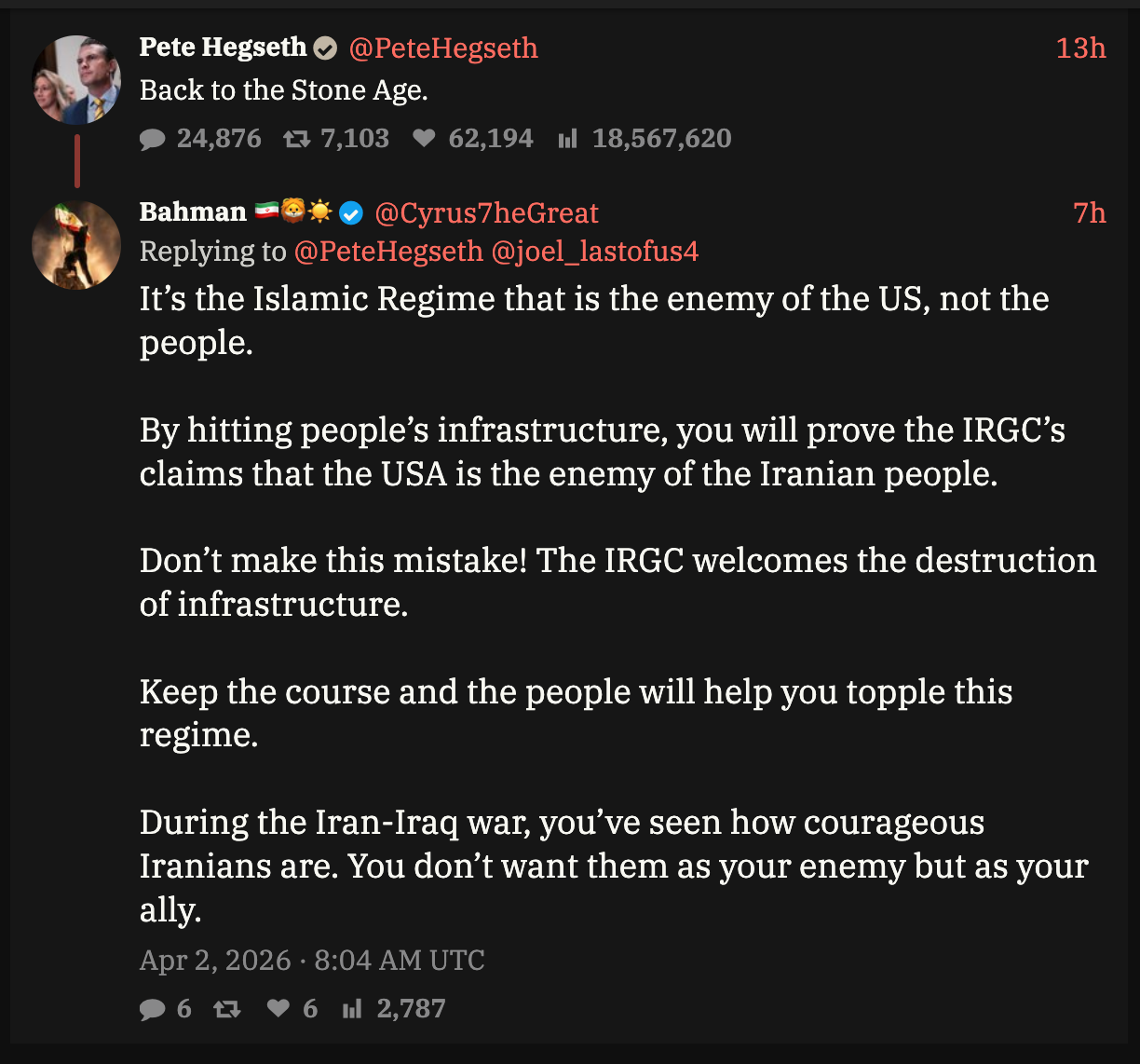 false premise. in 2-3 more weeks the US wont give a fuck what Iran does because their entire industrial base will be destroyed. the US is negotiating with bombs. whatever schizo shit the iranians babel about is unimportant. it is really a failure of imagination of you people who think that words matter more than physical reality not to understand this. nothing the US does is contingent on Iranians and their schizo ideology. the US can and will change material facts and that is a physical process that can and will be completed in 2-3 weeks.