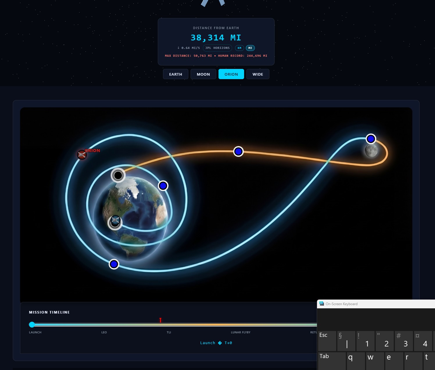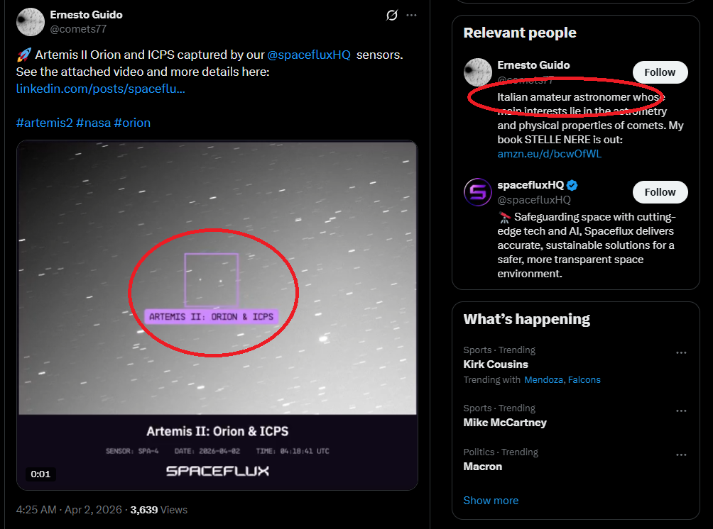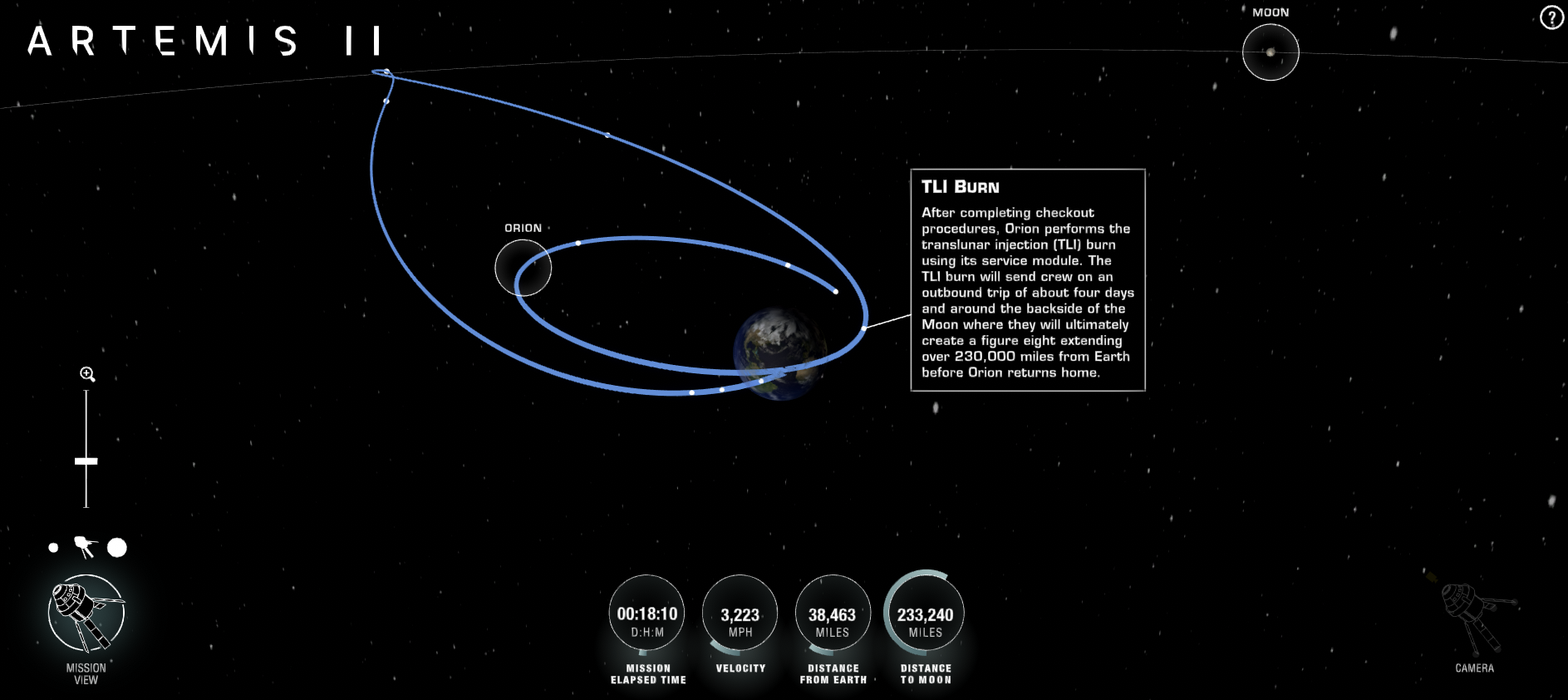 >>532207430It is 38 000+ miles from earth now.Technically still orbiting earth, but in a very high orbit, preparing for TLI (Trans Lunar Injection) burn about 24h after launch yesterday.After that it will take another 3 days to reach the moon, zip around it once, and then head back to earth.[ artemistracker com ]The Orion capsule is about 4 meter in diameter.The solar panels are about 19 metres end to end.The telescope you need, and the clear sky condition you'd need are both unlikely.The ISS is orbiting at around 250 miles above earth, and you can easily find pictures and even videos from hobby photographers with some hefty gear.4chan is REALLY not your best source of information about this topic...