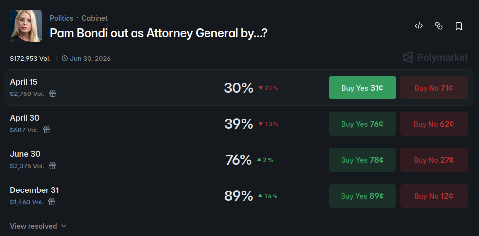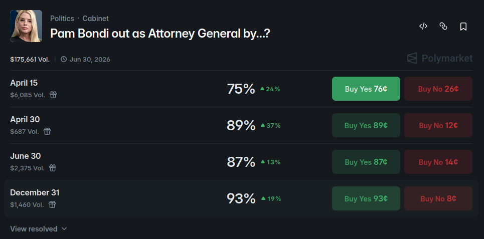 What are the odds she goes down as another scapegoat just like Kristi Noem?https://www.nytimes.com/2026/04/01/us/politics/trump-pam-bondi-future.html