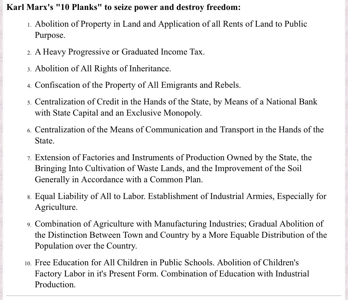 >>532215943>Neither communism's biggest haters nor communism's biggest fans can define Communism.Which is funny because it's very clearly defined in black and white. Basically everything on this list is being put into practice or has been in practice for decades now in the US but these goyim retards will still call our system capitalist.