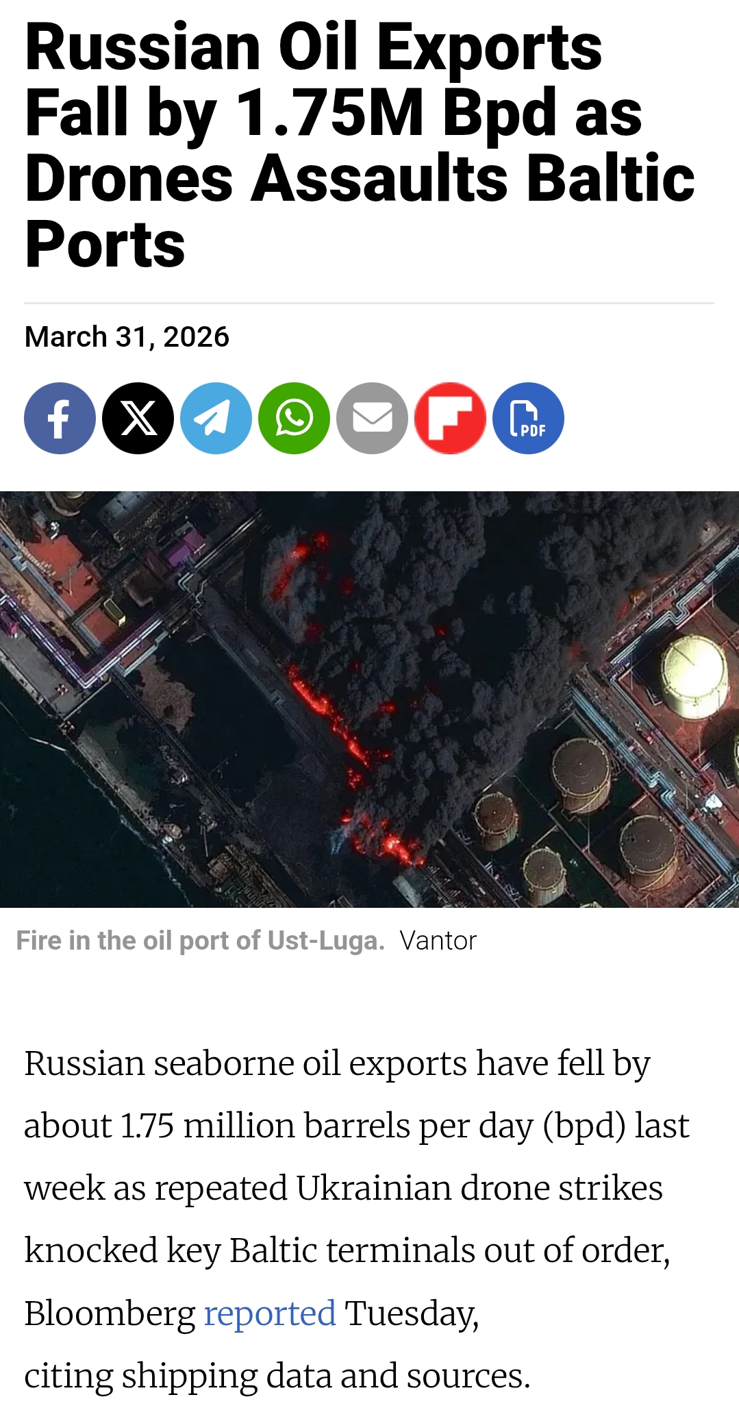 In more peremonga turned zrada news:>The crude terminal at Russia’s Baltic port of Ust-Luga appears undamaged in satellite images after multiple Ukrainian drone attacks in the region.>An April 1 satellite image from Planet Labs PBC shows damage to storage tanks at Novatek and Ust-Luga Oil, while the Transneft tanks (bottom of the picture) appear intact.