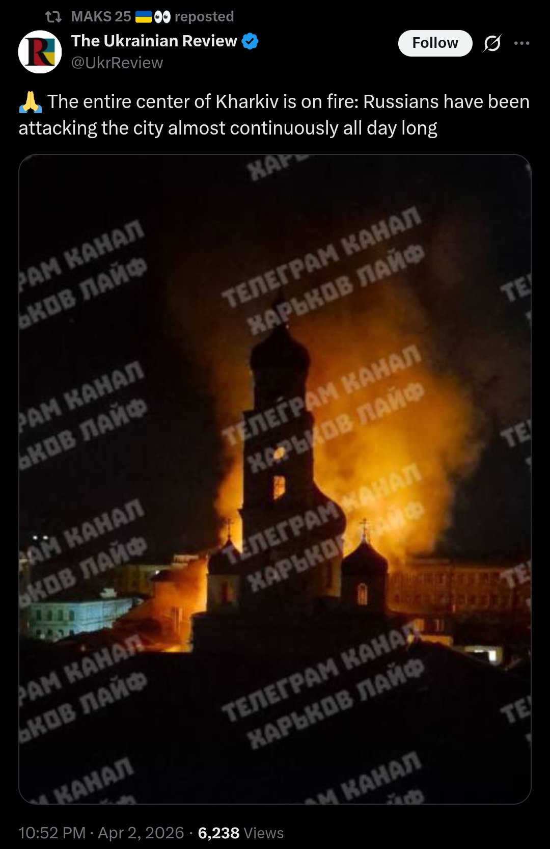 >The entire center of Kharkiv is on fire: Russians have been attacking the city almost continuously all day longdamn terror bombers