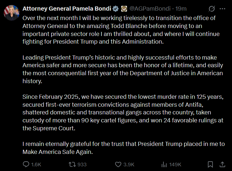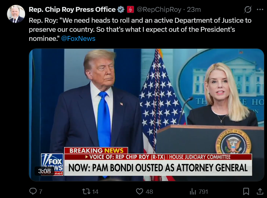 Who do you want the new DOJ Attorney General to be?https://x.com/RepChipRoy/status/2039780883251830918