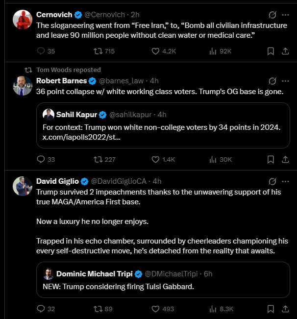 Starting to move forward. I always rooted for Trump because Trump is kino. I don't actually care about politics or policies. I've never been a "republican".Disappointed with the Iran war.Now with everyone getting fired, seems like a meltdown.I am about over this administration.Not voting in midterms because the Rs in my state are trying to ban everything like retards.At least we made liberals cry again.That's all that matters.Hoping for a new party and a fresh new candidate.Otherwise I'ma lay low but it's nice to not think about politics, and touch green grass and breathe fresh airp.s.you lost