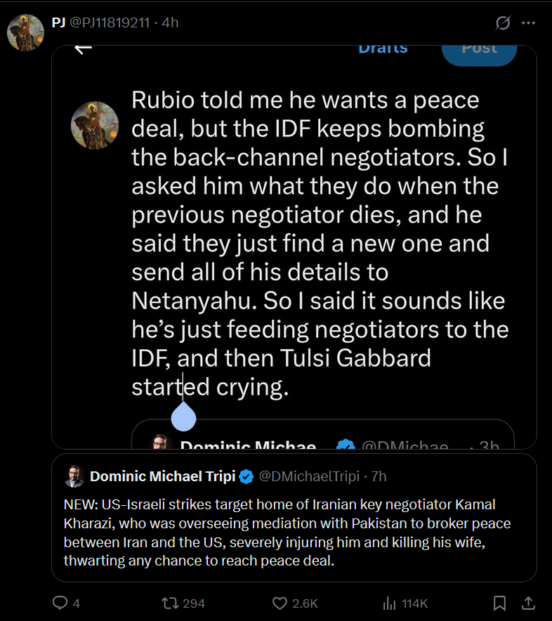 >>532223248Ah there you are. You might find this funny despite the person who wrote ithttps://x.com/Partisangirl/status/2039765170785062924