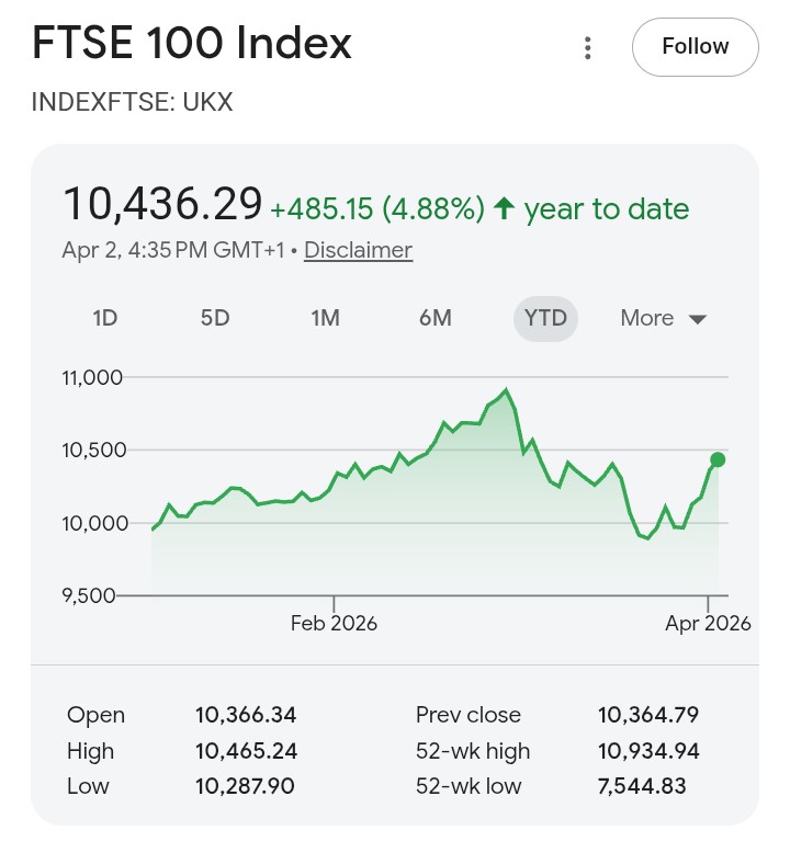 >>532225080UK doing good>Despite a 6.7% slide in March due to the energy price shock of the Middle East war,(the FTSE 100 experienced its 15th worst month since 2001. The 6.73% decline compared with the all-time worst for the 25-year period of 13.81% in March 2020)>the blue-chip index still managed to finish a tumultuous quarter up by 2.5%.>The next best performance was by Japan's Nikkei 225 after a rise of 1.4%, while the S&P 500 index lost 4.6% and Nasdaq Composite reversed 7.1% as tech valuations came off the boil.