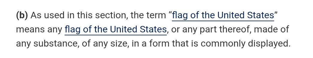 >>532236935No, it's not.It's retarded, but it's not illegal unless it's made from an *actual* flag that can be put on display (flown or hung). Just having that pattern doesn't count.