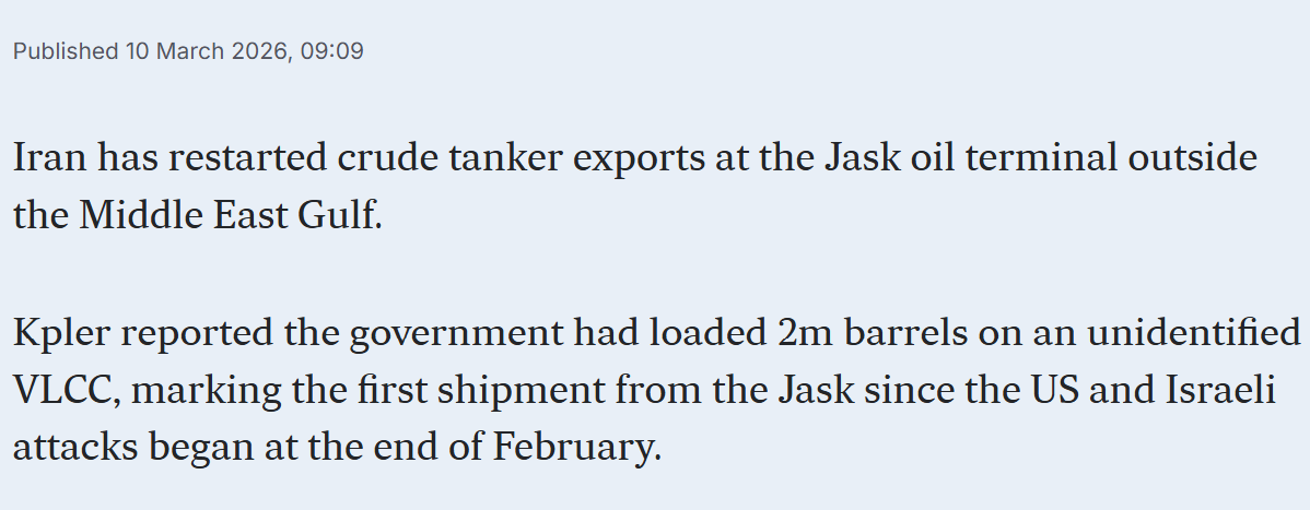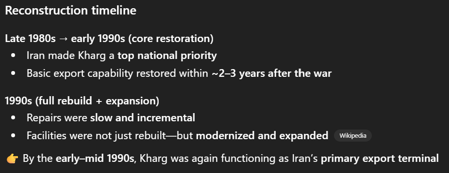 The thing is that I don’t think Kharg is that irreplaceable. There are no pipelines to there or anything. It’s just a logistic job where small ships bring oil to big ships. Iran could easily have a plan B where tankers go to other places at decreased efficiency.