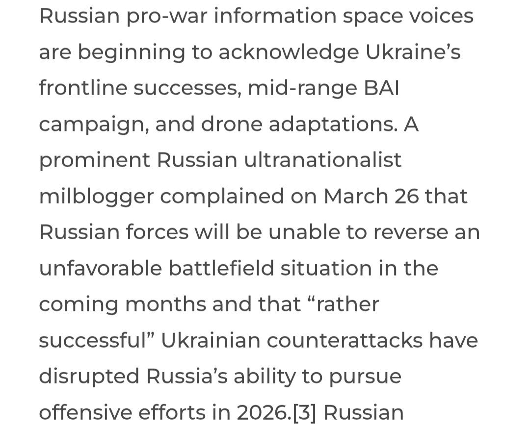 Previous: >>532227163Day 1,499 – Daily assessment: understandingwar.org/analysis/russia-ukraine/#research▶Latest>Lieutenant General Oleksandr Ivanovych Otroshchenko was killed in An-26 plane crash - Six officers from the Northern Fleet headquarters were killed too>1,3 million russians eliminated in the 3-day SMO (with many more to come)>russia loses another Su-34 fighter-bomber>russian An-26 military transport aircraft lost over Crimea>for the fourth consecutive month (Dec - Mar), the “mobilized vs eliminated” balance remains firmly negative t. Magyar>Large explosion at Nizhnekamsk refinery>Ukrainian drones once again attacked Ust-Luga and Primorsk ports in Leningrad region>Kremlin Officially Denies™ incoming general mobilisation>General Cherry will manufacture drones in USA>Ukraine to supply naval drones to Gulf countries>Ukraine develops 12-gauge anti-drone 'web' cartridges>The SMO came to Ust-Luga again>Strikes on Ust-Luga, Primorsk, Kirishi and Yaroslavl created a 2.5M bpd bottleneck for russia’s oil export and refining - Magyar>Ukraine securing 10-year defense deals with Gulf states amid Iran war>Flamingo missiles strike russian explosives plant Promsintez in Samara region>Yaroslavl refinery droned twice>Kirishi refinery droned>Ust-Luga port droned again>putin asks oligarchs to donate to budget as cost of Ukraine war soars (first time he did this directly)>Ukraine continues to gain more land than they lost in March/February and will continue to do so in April▶Telegramrentry.org/telosint2023t.me/ukr_pics▶Intelt.me/DeepStateENodin.tradoc.army.mil/WEG (equipment explorer)ukr.warspotting.net (visually confirmed losses)▶Mapsdeepstatemap.live/enliveuamap.com/en▶DISPOSABLE SOLDIER (diary of a RU mobik)TOURS 1-4: files.catbox.moe/mpcw7p.zip▶12 min of TZD in one ditch (Pokrovsk area) - 28 killedfiles.catbox.moe/sxbxfb.mp4