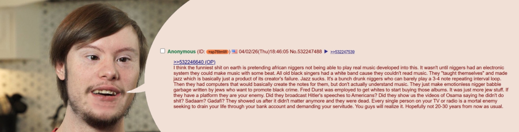 >>532248587It's forced as fuck retard. You retarded ass human spermatozoa. Most of you are soulless jizz walking around in human form looking for an egg to fertilize. No contemplation of the circular soulless existence you live. I fucking hate you guys. All of you, every fucking person alive except my grandparents, and maybe your guys' if they aren't minorities. Rock etc. is all jewish bullshit. You only need to give glory to God, not sin. Then people are surprised shit sucks. >what happenedThe walking jizz