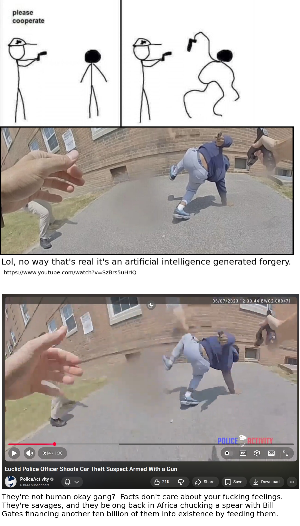 >You're either with us or against us.Fairly straight forward backbone of the evolution of cooperation, this circuit has atrophied almost 100% in white people when compared to Purple Niggers that can jump 10 feet into the air from the African Rainforest, but has come back into fashion with white people sitting in plastic chairs in air conditioned rooms posting shit on social media no job no education no training no income.Niggers express this circuit much more distinctly than white people do and you can see them yell it from the roof tops.Get the full argument between the nigger and the girl around: "fucking get how I like bitch damn", and you'll get a textbook microcosm.https://www.youtube.com/watch?v=BMqclhG2foY