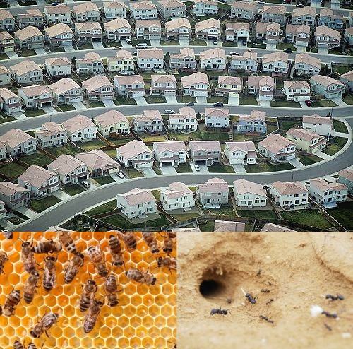 1. Chimpanzees don't exist in massive communities.2. Chimpanzees aren't hyper specialized in their roles.3. Chimpanzees don't try to maximize the efficient use of their territories.Our origins have something to do with insects.