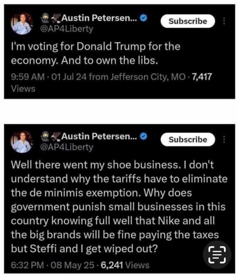 >>532253393At a certain point of trying to shit on the libs by cutting off your own nose, your face has been fully peeled off and the libs, albeit covered in shit, are looking at you in abject horror.This is compounded that short of sending federal agenta into a couple of blue cities, most blue states/lib havens have been fairly isolated from MAGA policies. You think high gas prices are hurting the subway-riders in NYC and trans don't have access to bathrooms in Seattle?