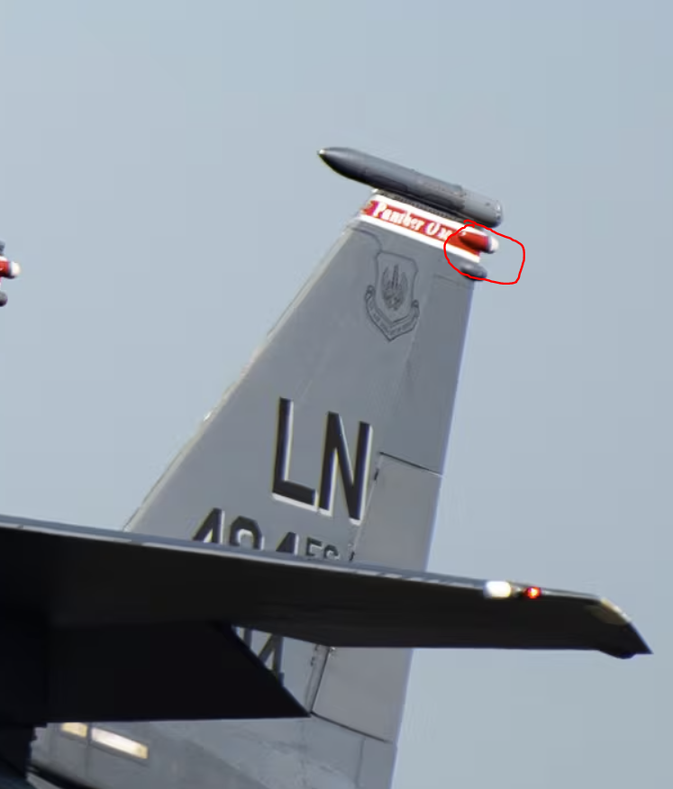 >>532256387>>532256413Brazilanon, is it the vertical stablizer from an F-15?A number of American F-15s with the Lakenheath "In Europe" decal also have colored tips like that at the top, see pic related.
