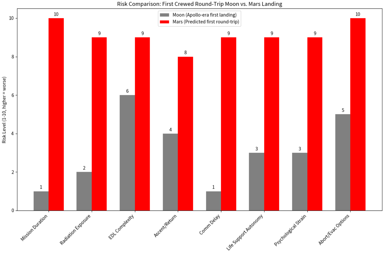 People think that landing on Mars will be kind of like landing on the moon. No. It's almost inevitable we will see astronauts get blown up in 4K. Mission duration:>Moon: 8-12 days total>Mars: 2-3 years total Radiation:>Moon: A few mSv>Mars: 500-1650+ mSvCommunication delay:>Moon: 1.3 seconds>Mars: ~14 minutesThe Mars spacecraft will have to land within 7 minutes and it takes 14 minutes for them to communicate with it from Earth. Meaning they can't do shit to control the landing like they did with the Moon. No real time commands from Earth are possible. 60% of unmanned missions to Mars have failed thus far. This shit is insane. Even if the crew lives, they'll probably get cancer later on.