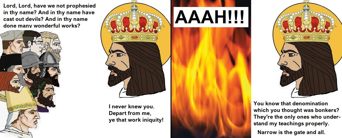 >>532275699You are so dumb. Free will doesn't disappear from believers. Having the Holy Spirit isnt a guarantee that you will produce good fruits, because a relationship with Jesus Christ is dependent on your complience and obedience to him. You are preaching some form of calvinism, that sounds similiar to "perserverance of the saints".A christian must make the choice daily to actively obey Jesus Christ, to willingly repent of sins. You can have the Holy Spirit and decide not to carry your cross, and get high and party, and you will be convicted which you can choose to ignore and eventually you will be cut off and cast into the lake of fire, where all born again believers who don't overcome this world will end up. All born again christians who dont stop lying, looking at women with lust on the streets (matthew 5:27-30), masturbators, thieves etc they will all be told Depart from me you who Breaks Gods laws