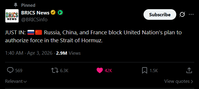 >>532264915Cope harder Pawelhttps://archive.ph/20260403073557/https://www.bloomberg.com/news/articles/2026-04-03/french-owned-container-ship-exits-hormuz-in-first-since-iran-war>The CMA CGM Kribi sailed from waters off Dubai toward Iran on Thursday afternoon local time, signaling that its owner was French, according to ship-tracking data. It stuck close to the Iranian coast, moving through a channel between the islands of Qeshm and Larak, openly broadcasting its journey. On Friday morning, it signaled that it was off Muscat. Two people familiar with the situation also said the ship had crossed.