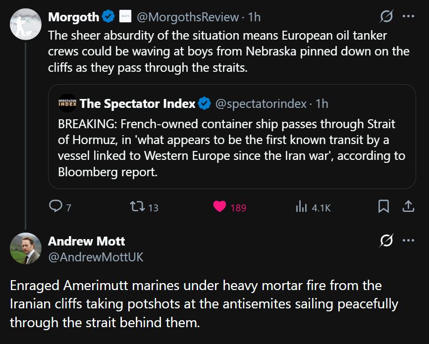 >>532266042Thats all it takes, the precedent is huge, countries now have to seriously consider it.And imagine how hard it becomes for america to "open" the strait if the military operation is going to impede or slow oil once it starts moving again. Theyd become even more of a pariah. Iran looks like the reasonable country trying to get navigation restored during wartime, America looks fucking insane turning the Strait into a hot zone.The window to try to seize the strait is closing faster than ever. I reckon by the time the third carrier is there and theyre ready to deploy itll be too late thrrelly be 20-30% prewar traffic going through on irans terms and that becomes the new normal