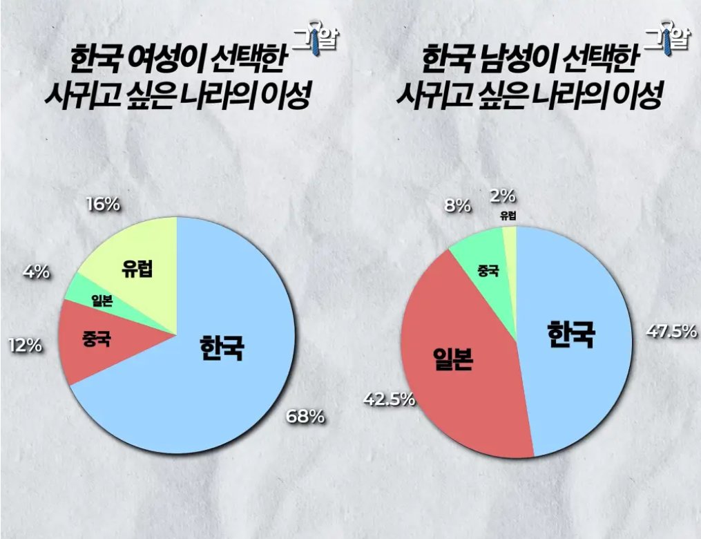 >A popular Korean YouTuber did a street survey on which country's men or women people are most attracted to.>Survey Results:Which nationality would Korean women like to date?South Korea - 68%Europe - 16%China - 12%Japan - 4%Which nationality would Korean men like to date?South Korea - 47.5%Japan - 42.5%China - 8%Europe - 2%>The survey results sparked a heated debate online:Women were largely frustrated by the strong preference men showed for Japanese partners.Men found it absurd or nonsensical that Chinese partners ranked relatively high among women's choices.