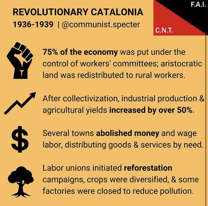 >>532267560>catalonia anarchismthat lasted for not even two weeks. Since there was no government, the communists co-opted and replaced the anarchist and started systematically purging them (murder). the ones who fled were then caught by the falangists and purged though some were lucky enough to spend a decade in concentration camps. Anarchism is just a front for commies