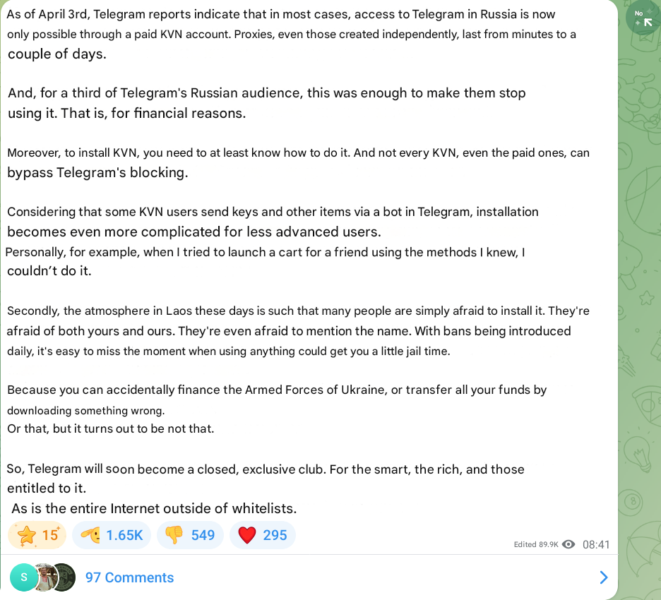 Guess everything is down in Mosquew, something about IP blocks for telegram and nothing works anymore