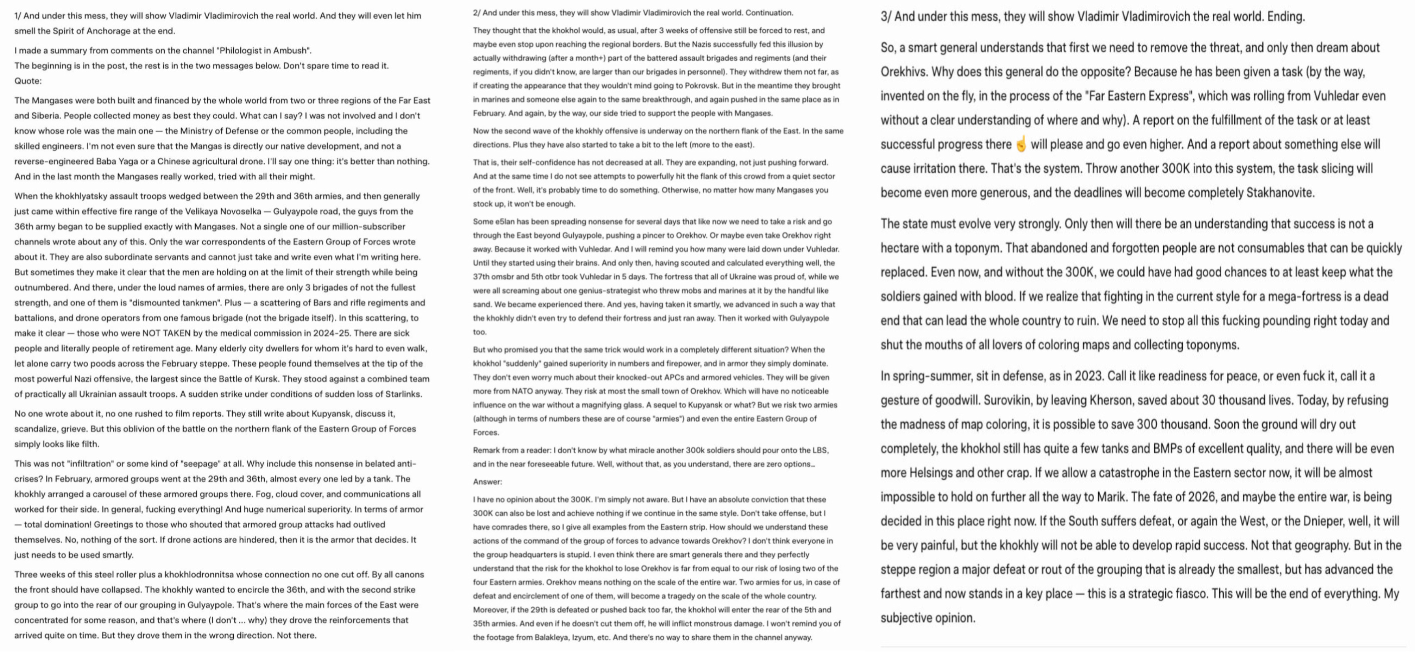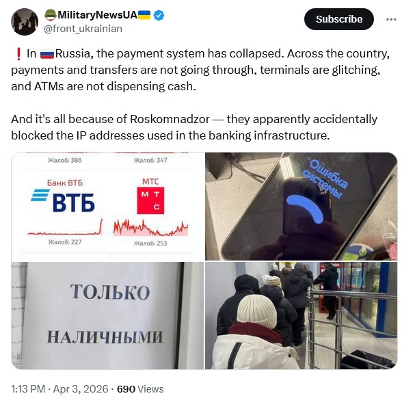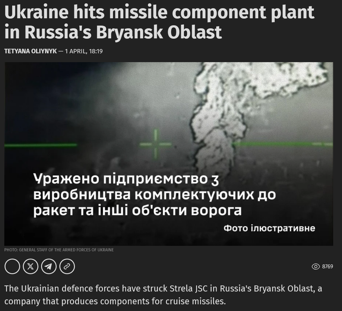 Previous: >>532238945Day 1,500 – Daily assessment: understandingwar.org/analysis/russia-ukraine/#research▶Latest>Russian Su-30 fighter jet crashes in Crimea >Russian Northern Fleet Contract Soldier Sets Fire to Aircraft and Armored Vehicle>Drones Strike Area of Russian Explosives Plant in Morozov, Leningrad oblast>Lieutenant General Oleksandr Ivanovych Otroshchenko was killed in An-26 plane crash - Six officers from the Northern Fleet headquarters were killed too>1,3 million russians eliminated in the 3-day SMO (with many more to come)>russia loses another Su-34 fighter-bomber>russian An-26 military transport aircraft lost over Crimea>for the fourth consecutive month (Dec - Mar), the “mobilized vs eliminated” balance remains firmly negative t. Magyar>Large explosion at Nizhnekamsk refinery>Ukrainian drones once again attacked Ust-Luga and Primorsk ports in Leningrad region>Kremlin Officially Denies™ incoming general mobilisation>General Cherry will manufacture drones in USA>Ukraine to supply naval drones to Gulf countries>Ukraine develops 12-gauge anti-drone 'web' cartridges>The SMO came to Ust-Luga again>Strikes on Ust-Luga, Primorsk, Kirishi and Yaroslavl created a 2.5M bpd bottleneck for russia’s oil export and refining - Magyar>Ukraine securing 10-year defense deals with Gulf states amid Iran war>Flamingo missiles strike russian explosives plant Promsintez in Samara region>Yaroslavl refinery droned twice>Kirishi refinery droned>Ust-Luga port droned again▶Telegramrentry.org/telosint2023t.me/ukr_pics▶Intelt.me/DeepStateENodin.tradoc.army.mil/WEG (equipment explorer)ukr.warspotting.net (visually confirmed losses)▶Mapsdeepstatemap.live/enliveuamap.com/en▶DISPOSABLE SOLDIER (diary of a RU mobik)TOURS 1-4: files.catbox.moe/mpcw7p.zip▶12 min of TZD in one ditch (Pokrovsk area) - 28 killedfiles.catbox.moe/sxbxfb.mp4
