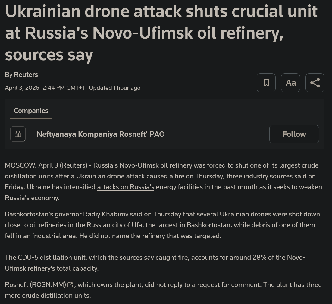 I missed this refinery getting droned. 1/4 of its distillation units has been destroyed.