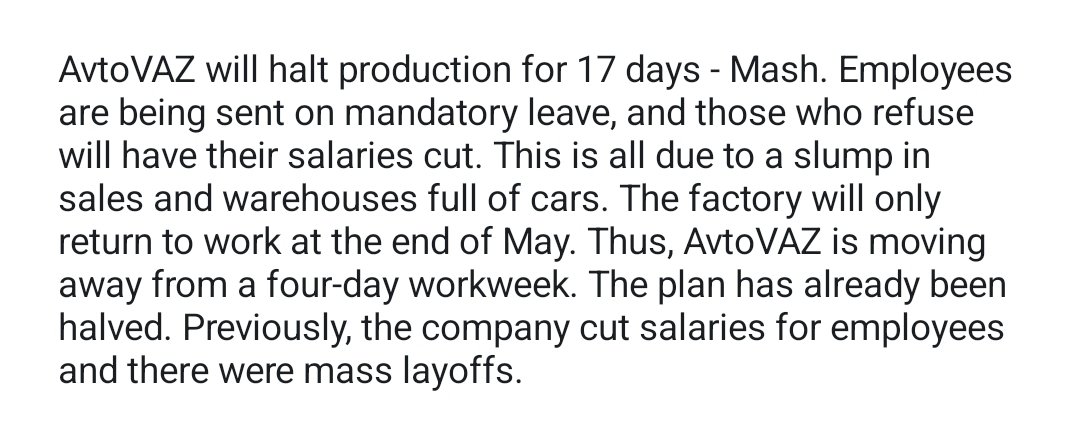 >Mass layoffs and cutting hours weren't enough, now Russia's largest auto manufacturer is shutting down production for 17 days. Workers will not be paid during this period.