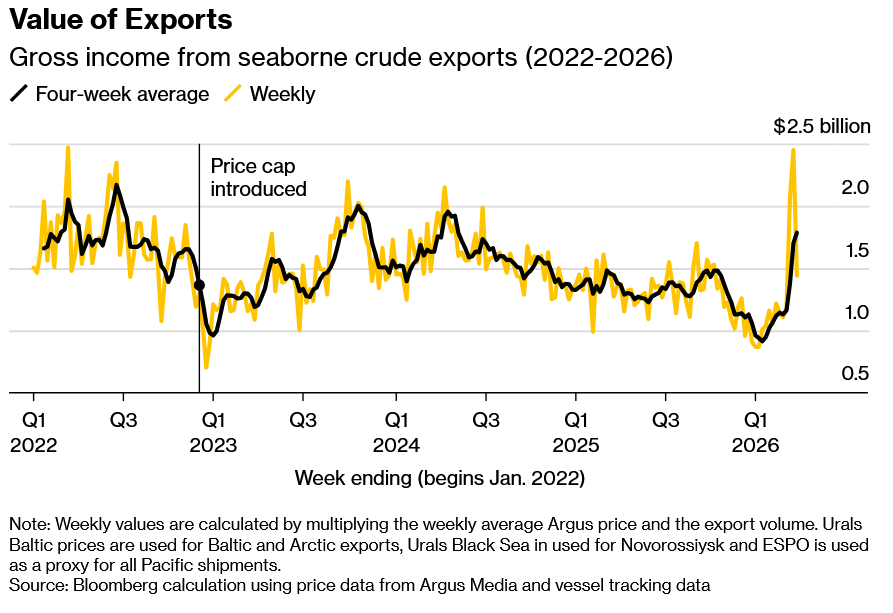 >Average price of Russian oil for tax purposes jumped to $77 per barrel in March, the highest since October 2023Taxes are based off the previous months' price. Brent in Sep 2023 peaked at $93 or about $20 cheaper than now.Gives you some idea of the effect of sanctions and shipping eating into pidor profit margins.