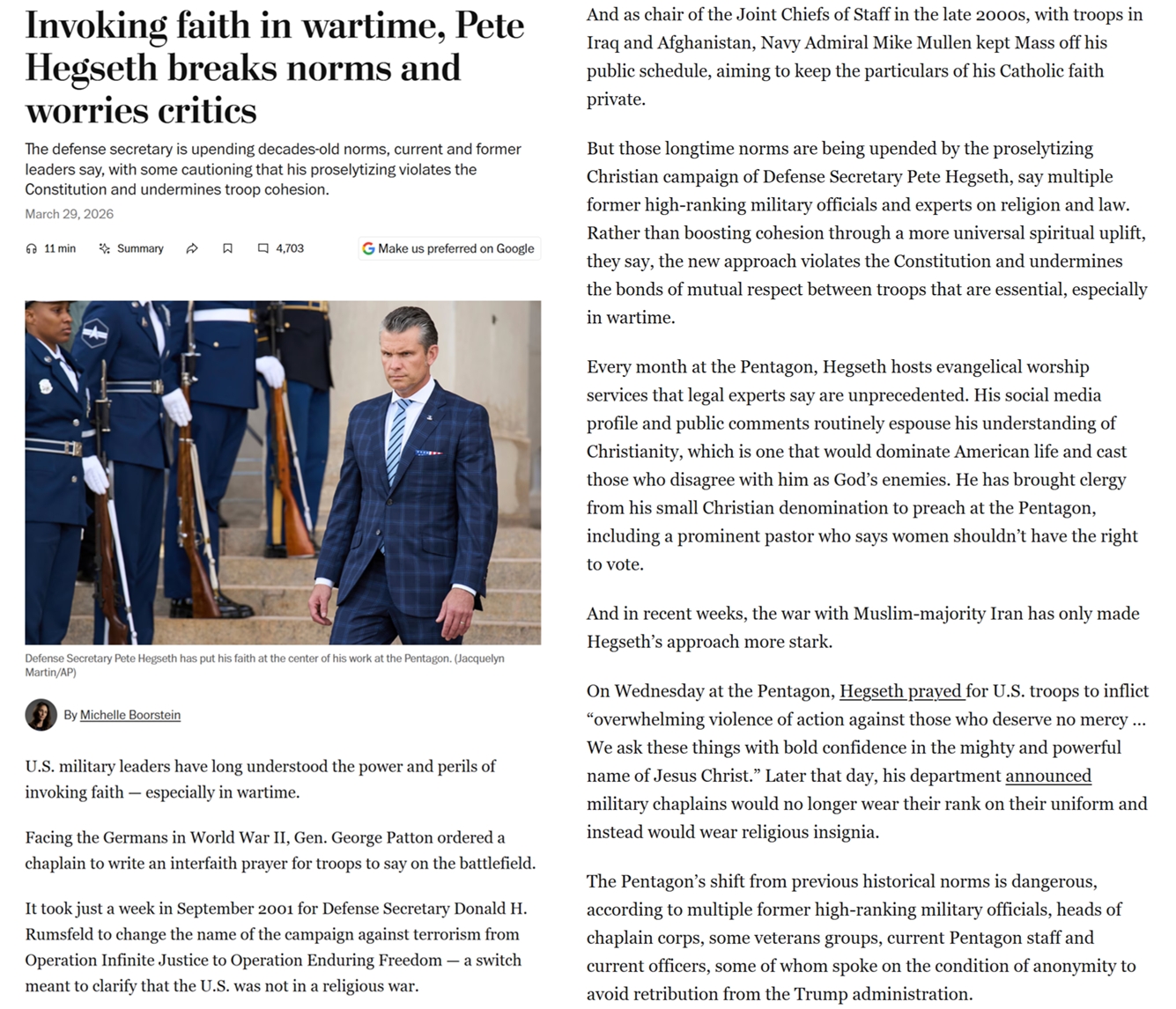 >>532280745>And in recent weeks, the war with Muslim-majority Iran has only made Hegseth’s approach more stark. On Wednesday at the Pentagon, Hegseth prayed for U.S. troops to inflict “overwhelming violence of action against those who deserve no mercy … We ask these things with bold confidence in the mighty and powerful name of Jesus Christ.” Later that day, his department announced military chaplains would no longer wear their rank on their uniform and instead would wear religious insignia.He is trying to frame the war with Iran as Christianity vs Islam