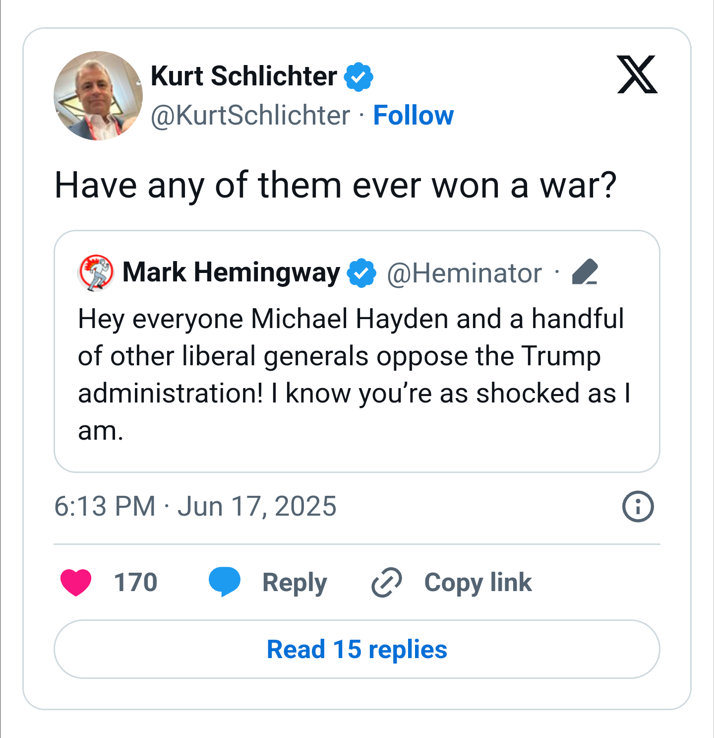 >>532277278>Throwing out Military Personnel with experience who don't agree with me is a great idea!Yeah, that is literally how you get into stupid fucking wars like Iran. Post-Iraq doctrine was to actually listen to people when they tell the rah rah faux macho faggots to use their brain before sending Americans into meat grinders.