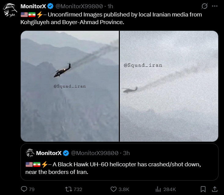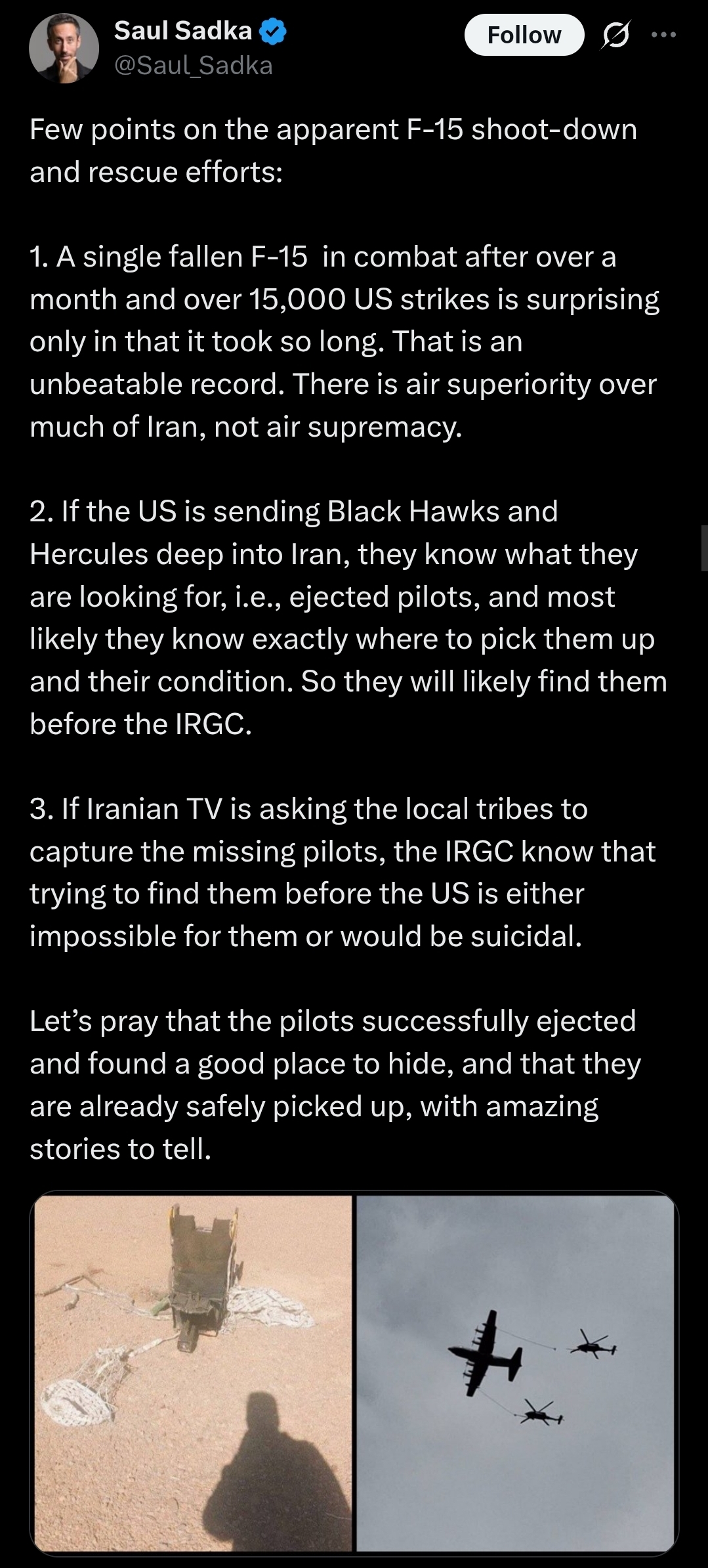 Reportedly footage of an ongoing CSAR (Combat Search & Rescue) mission to recover a pilot & WSO (Weapons Systems Officer) showing a C-130 & 2x UH-60 Blackhawk helicopters flying south of the city of Lali in Iran’s Khuzestan Province following a USAF F-15E being shot down.Iranian state media has shown images of the ejection seats & plain debris so the crew is presumed to be alive.American officials have not commented on the possible shoot down nor the ongoing rescue mission.
