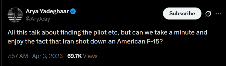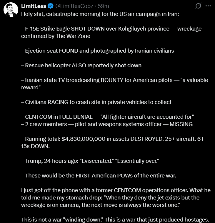>>532279330>>532279280If the Department of War confirms a downed craft then sure, until then I'll file this along with the claim of Iran taking out an aircraft carrier