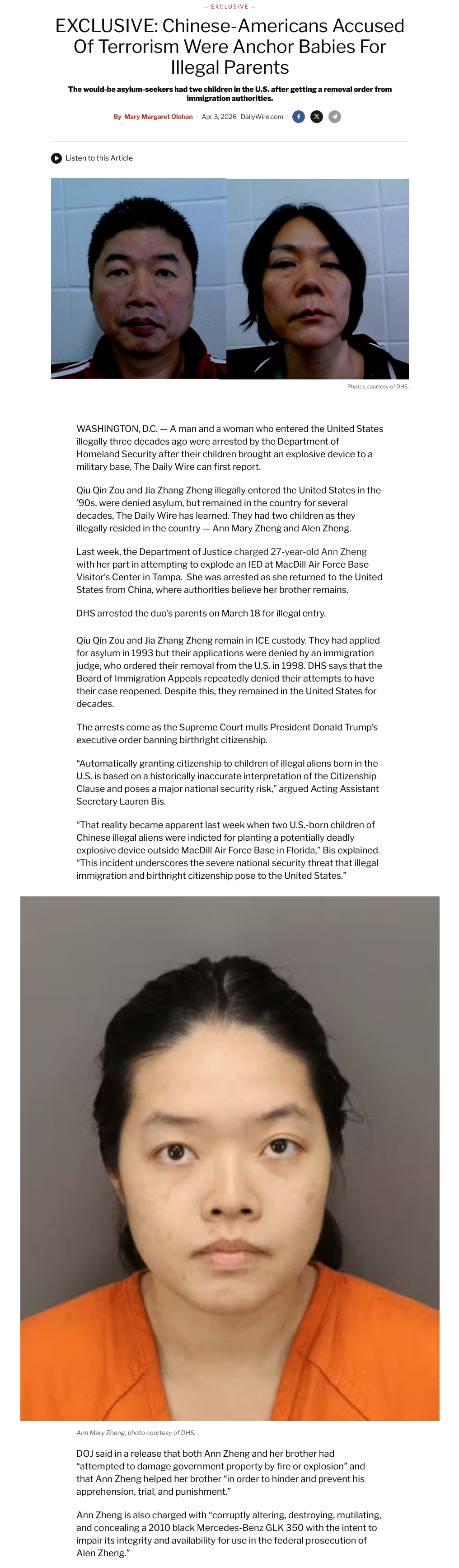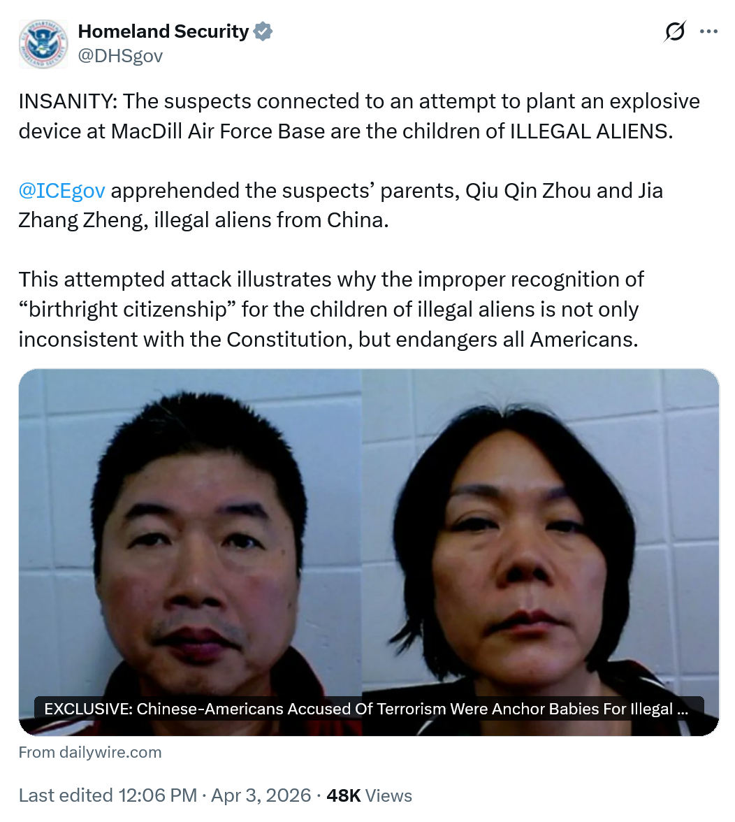 The Chinese-American brother and sister duo accused of planting a bomb at MacDill Air Force Base in Tampa Bay, Florida, on March 10 were born in the U.S. to Chinese illegal aliens. Their parents, who illegally entered the U.S. in the 1990s, had their asylum applications denied in 1998 and remained in the country illegally for decades. The parents were arrested by ICE on March 18 and remain in custody, according to The Daily Wire’s @MaryMargOlohan. The incident comes as the Supreme Court is actively considering President Trump’s executive order aimed at restricting birthright citizenship. The order seeks to limit automatic U.S. citizenship for children born on American soil to parents who are neither U.S. citizens nor lawful permanent residents. https://x.com/i/status/2040073088352612462