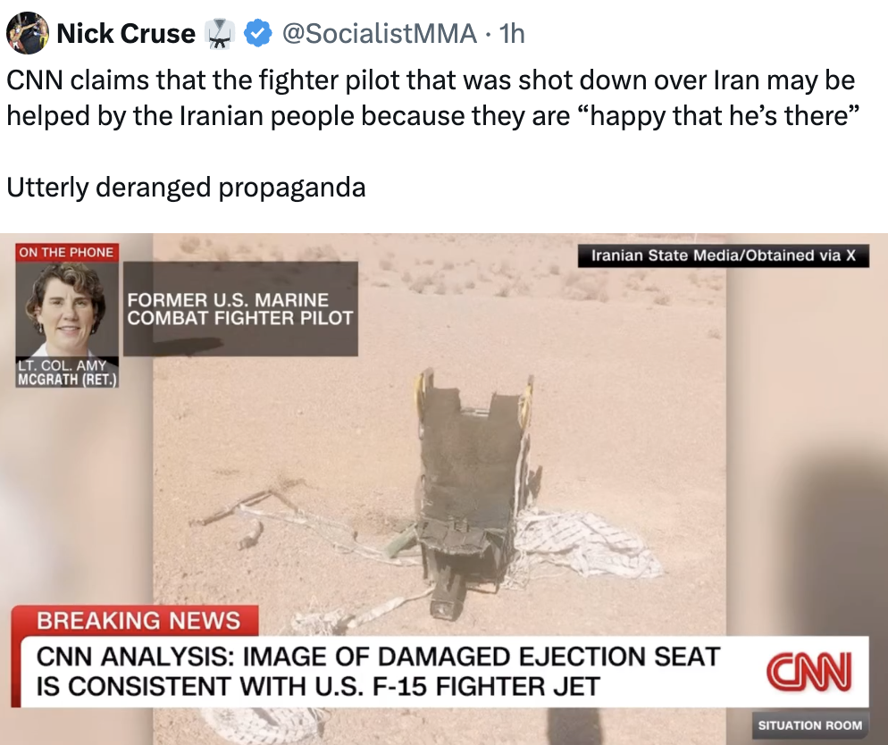 Fox News reports that US Marine infantry units are already on their way or ready to go to Iran to extract the crew of the F-15 aircraft that was shot downhttps://t.me/From_hebron/401769Lmao.They're going to send their MEU to look for the copilot.>thousand man meat grinder just to rescue a downed copilot who may or may not still be alive.