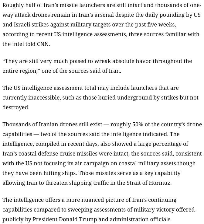 >>532296572>2/3 more weeks and the US will leave without any concessions made and Trump will have his "Mission Accomplished" and maybe the first annual Dubai Big Dick price.The flaw in this plan is that the US can't leave and take Israel with it. Israel is running out of not only defensive interceptors but also offensive cruise missiles. Once that happens, it'll have done whatever burst damage it can and media pressure on Iran to agree to a ceasefire will mount. Iran's strat is to keep steady dps on Israel and allow them to drain their vigour against its high HP.