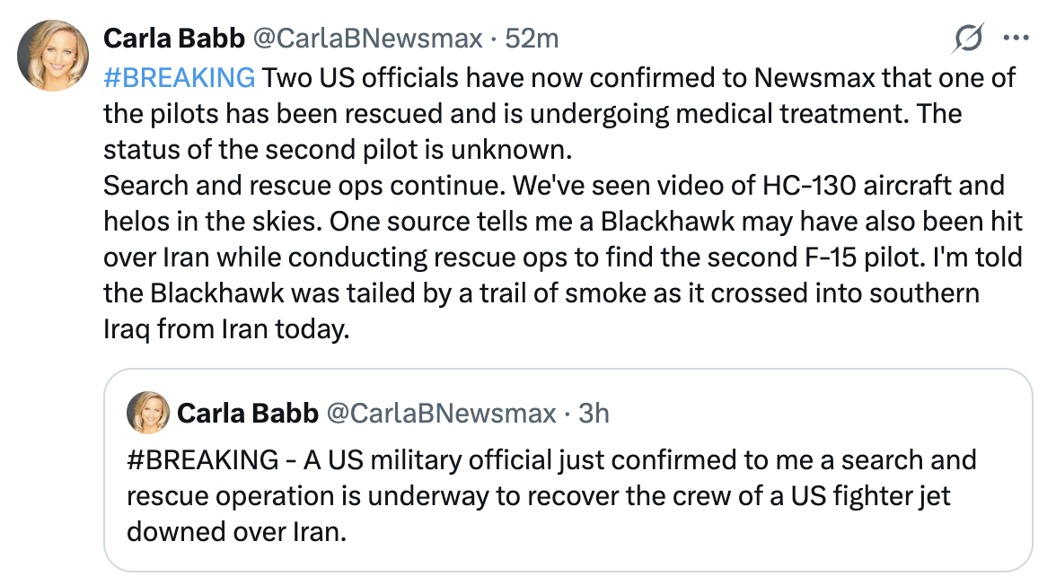 Previous thread >>532292532▶RECENT:>The downed F-15E pilots have been identified as Naval Flight Officer Lieutenant Chris Burnett and WSO Lieutenant Jeremy Stackhouse. >Iran has reportedly shot down yet another plane>IRGC reportedly threatens to bomb the $30,000,000,000 Stargate AI data center in Abu Dhabi>Trump says US could open Strait of Hormuz, seize oil “IT WOULD BE A “GUSHER” FOR THE WORLD???”>French ship successfully crosses strait of hormuz>One pilot rescued a US official said>Possible aerial interception and downing of American helicopter pilot by Iranian forces>Habshan gas facilities in Abu Dhabi have temporarily suspended operations after a fire broke out due to falling debris following Iranian attack.▶Day 34>France joins Russia and China in rejecting UNSC resolution authorizing use of force to open Hormuz>Austria has denied any American operations over their airspace>US/Israeli airstrikes destroyed the B1 Bridge, which crosses Karaj river, northern Iran.>"Two to three more weeks until it's over" — Trump>NYT: "Iran is not currently willing to negotiate"▶Oilhttps://oilprice.com/oil-price-charts/>WTI $111.54>BRENT $109.03>DUBAI $128.52>Do not trust any "happenings" without link/proof▶Kinohttps://files.catbox.moe/20lpu8.mp4 (embed)https://files.catbox.moe/jv7tdp.mp4 (embed)▶Live-streams:[YouTube] LIVE: Middle East real-time cameras from Iran, Israel, Qatar and more (embed)[YouTube] LIVE: Tel Aviv and Jerusalem skyline as Iran war continues (embed)[YouTube] LIVE: Beirut skyline as Israel strikes Lebanon (embed)▶Telegram channelshttps://rentry.org/tgnews▶Israel Rocket Alertshttps://www.tzevaadom.co.il/en/▶Air Traffichttps://www.flightradar24.com/https://flightaware.com/livehttps://globe.adsbexchange.com▶Maritime Traffichttps://www.marinetraffic.com/https://www.vesselfinder.com/▶Bread:https://rentry.org/PIGOP