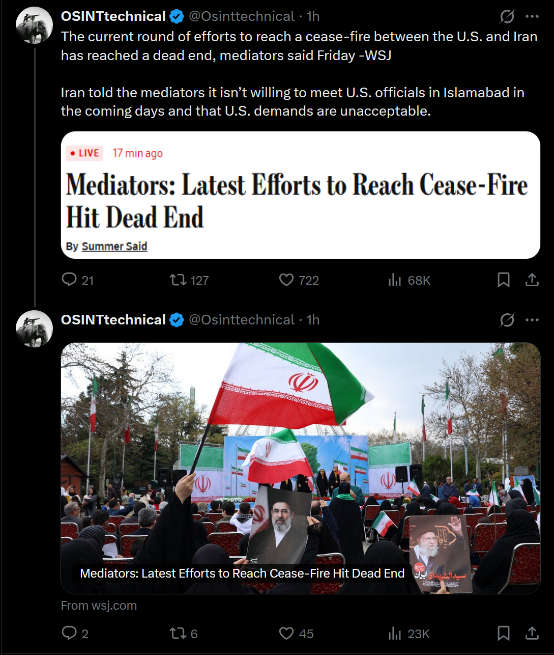 >The current round of efforts by regional countries led by Pakistan to reach a cease-fire between the U.S. and Iran has reached a dead end, mediators told the Wall Street Journal.