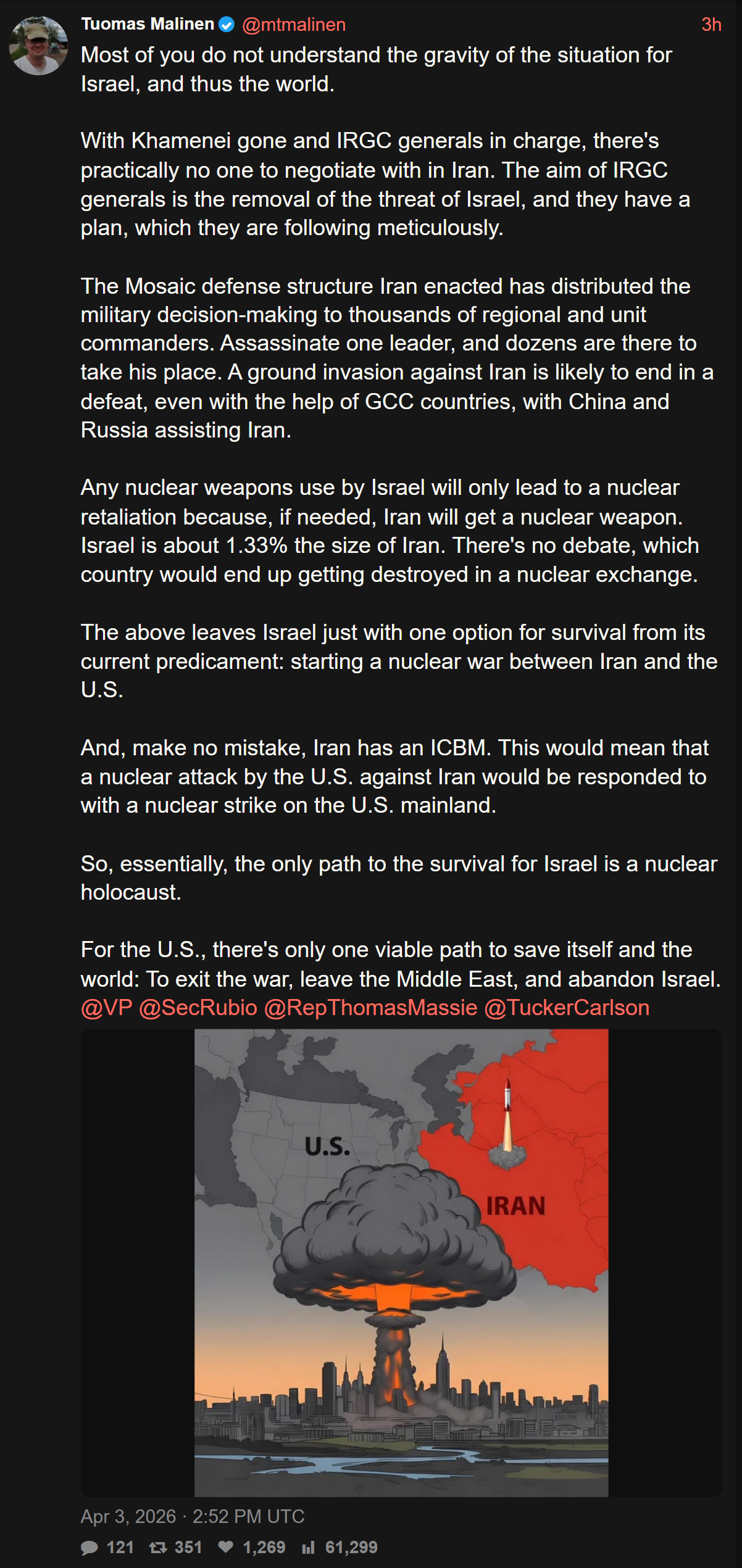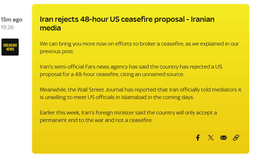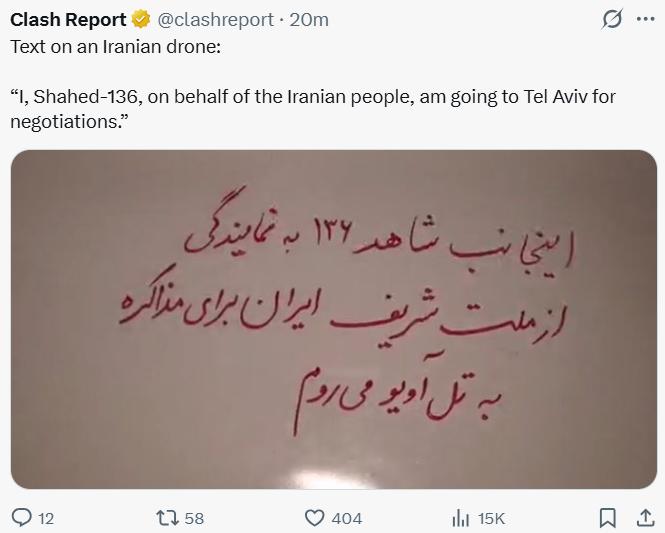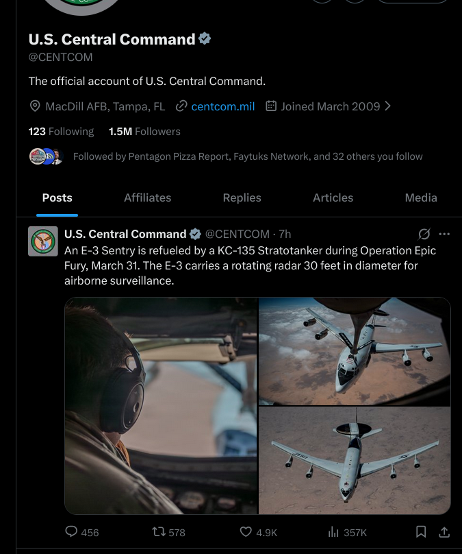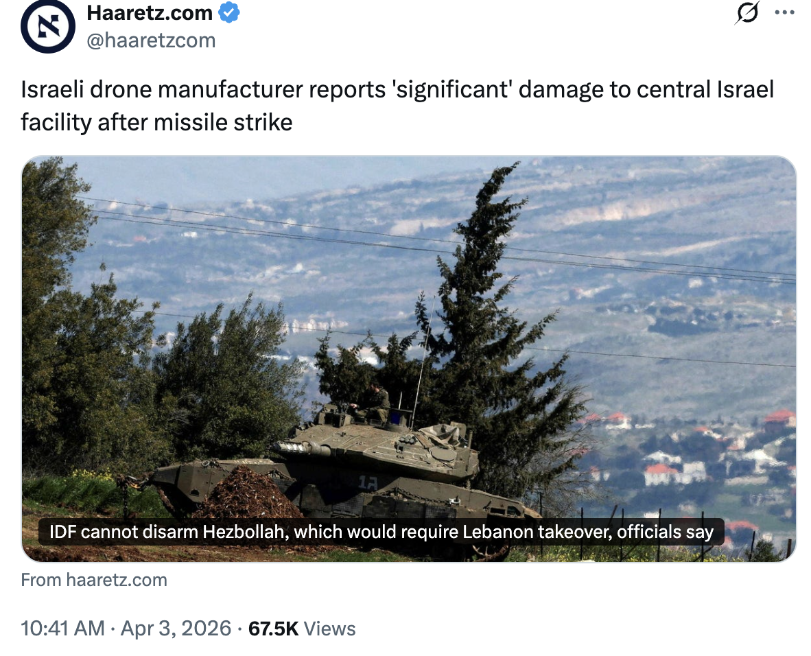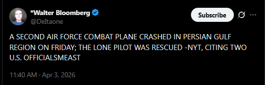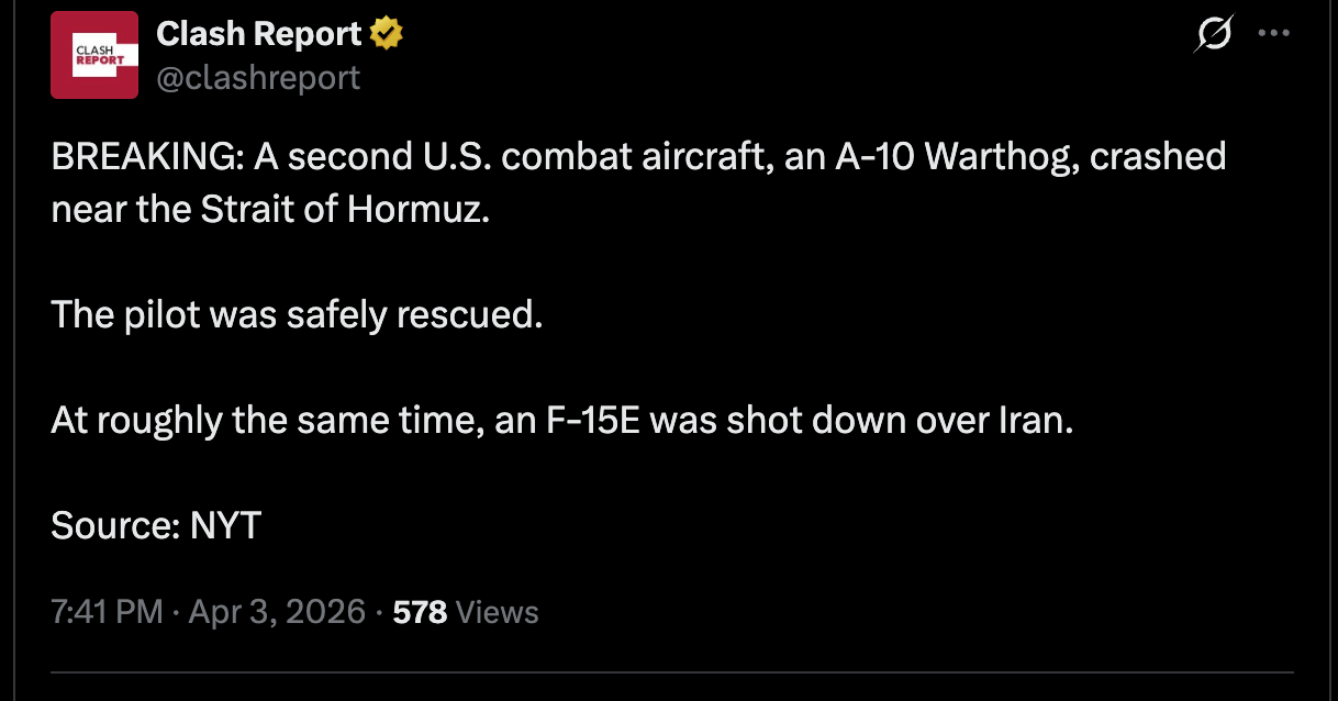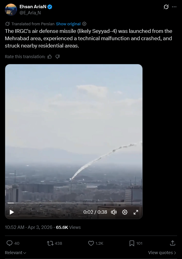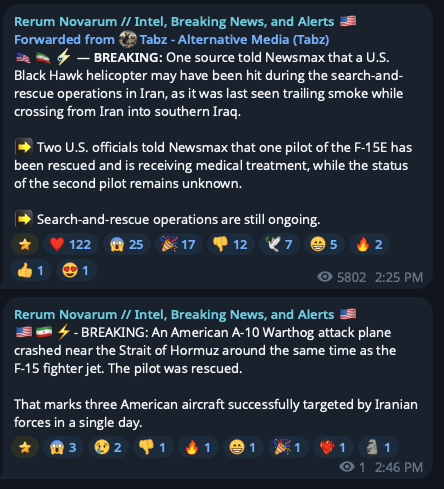 Previous Thread >>532292532▶Pilot Easter egg hunt:>US special forces have rescued one>Other one still missing▶RECENT:>IRGC threatens to bomb the Stargate AI data center in Abu Dhabi>An American F-16 allegedly has been hit by Iranian AD over Iraq>US and Iran militaries competing on an Easter egg hunt to rescue or capture the downed US air force pilots>The IRGC claims it took down an F-35, evidence points to an F-15>Possible aerial interception and downing of American helicopter pilot by Iranian forces>French ship successfully crosses strait of hormuz>Hegseth is purging US generals, 12 generals fired so far>Habshan gas facilities in Abu Dhabi have temporarily suspended operations>Iran has struck a Kuwaiti power and desalination plant, causing damage, according to the Kuwait Ministry of Electricity>IRGC’s 15 Khordad garrison in Isfahan’s Baharestan area was targeted with missiles again in the early morning▶Day 34>France joins Russia and China in rejecting UNSC resolution authorising use of force to open Hormuz>Austria has denied any American operations over their airspace>US/Israeli airstrikes destroyed the B1 Bridge, which crosses Karaj river, northern Iran.>"Two to three more weeks until it's over" — Trump>NYT: "Iran is not currently willing to negotiate"▶Oilhttps://oilprice.com/oil-price-charts/>WTI $111>BRENT $109>DUBAI $128>Do not trust any "happenings" without link/proof▶Kinohttps://files.catbox.moe/20lpu8.mp4https://files.catbox.moe/jv7tdp.mp4▶Live-streams:https://www.youtube.com/watch?v=4E-iFtUM2kkhttps://www.youtube.com/watch?v=O13ynBspdus▶Telegram channelshttps://rentry.org/tgnews▶Israel Rocket Alertshttps://www.tzevaadom.co.il/en/▶Air Traffichttps://www.flightradar24.com/https://flightaware.com/livehttps://globe.adsbexchange.com▶Maritime Traffichttps://www.marinetraffic.com/https://www.vesselfinder.com/▶Bread:https://rentry.org/PIGOP
