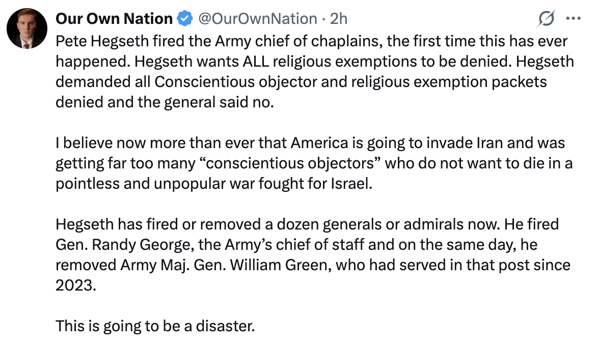 >>532301120>trump has lost the mandate of heaven after firing the entire US military leadershipApparently this was the first time in the history of the US Armed Forces that the chief Chaplain was fired and it is reported because Hegseth wanted him to disallow *all* exemptions for conscientious objectors. All.